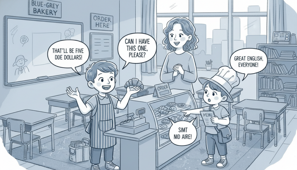 • 역할극 & 시뮬레이션: 실제 상황(레스토랑 주문, 여행 상황, 상점 이용 등)을 설정하고 역할극을 통해 영어 표현을 자연스럽게 익힙니다.